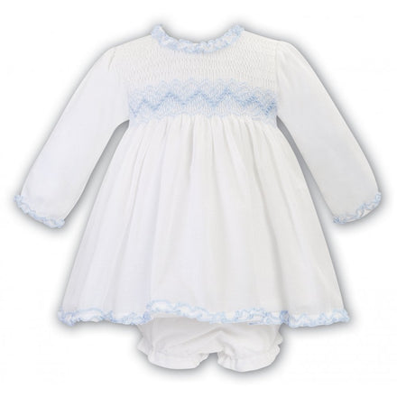 Sarah Louise Girls White with Navy Ribbon Smocked Dress