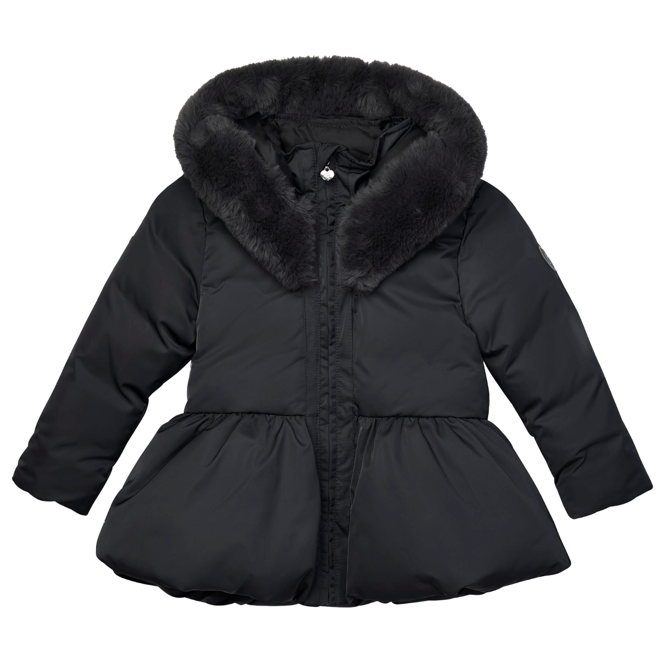 Girls black hooded jacket by A Dee. It is made in silky smooth polyester with warm padding and soft fleece lining. With pretty balloon styled frilly hem and faux fur trimmed hood.