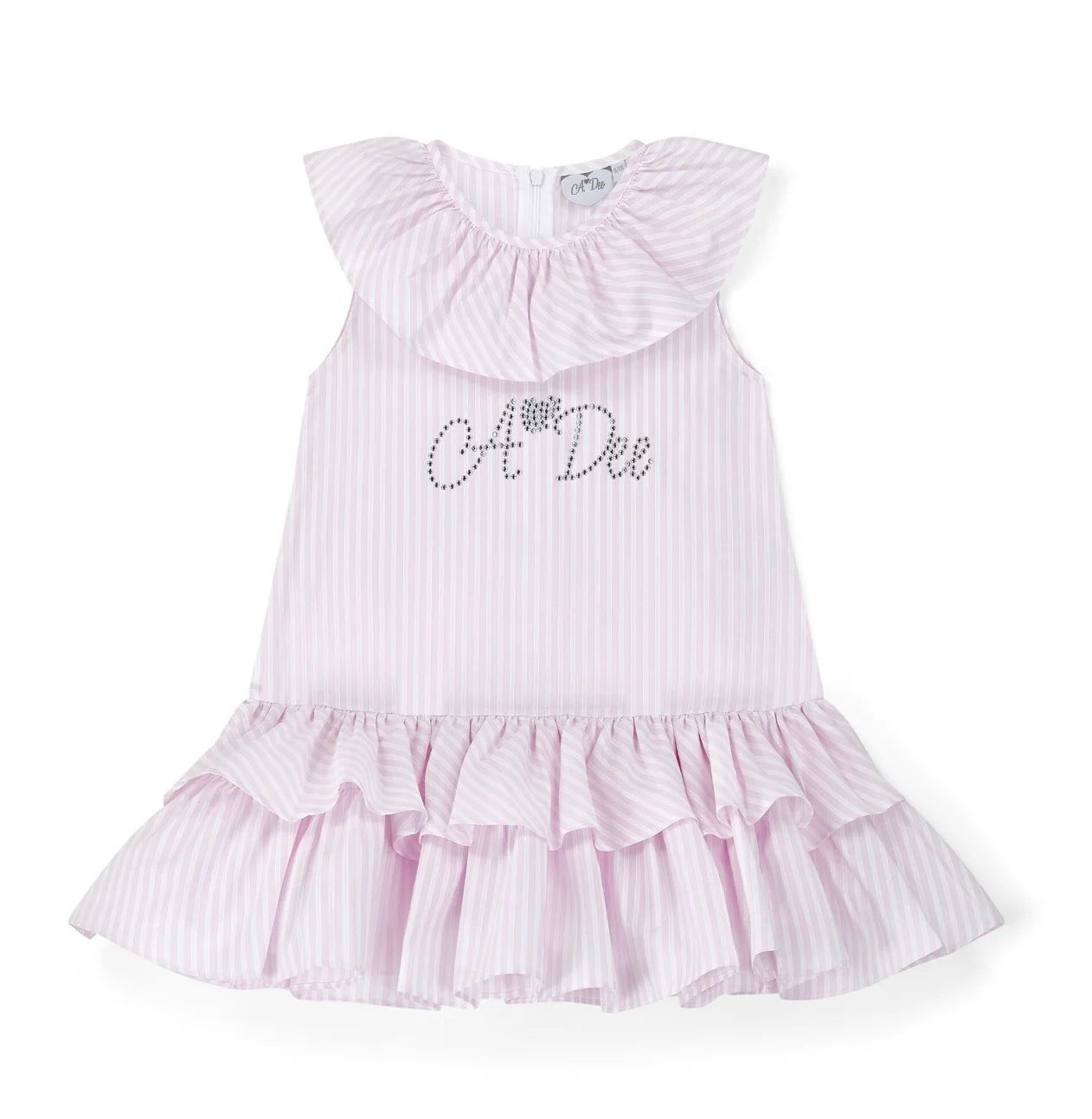 Poplin seersucker dress with ruffle neckline and double frill detail. The front features the designers logo.