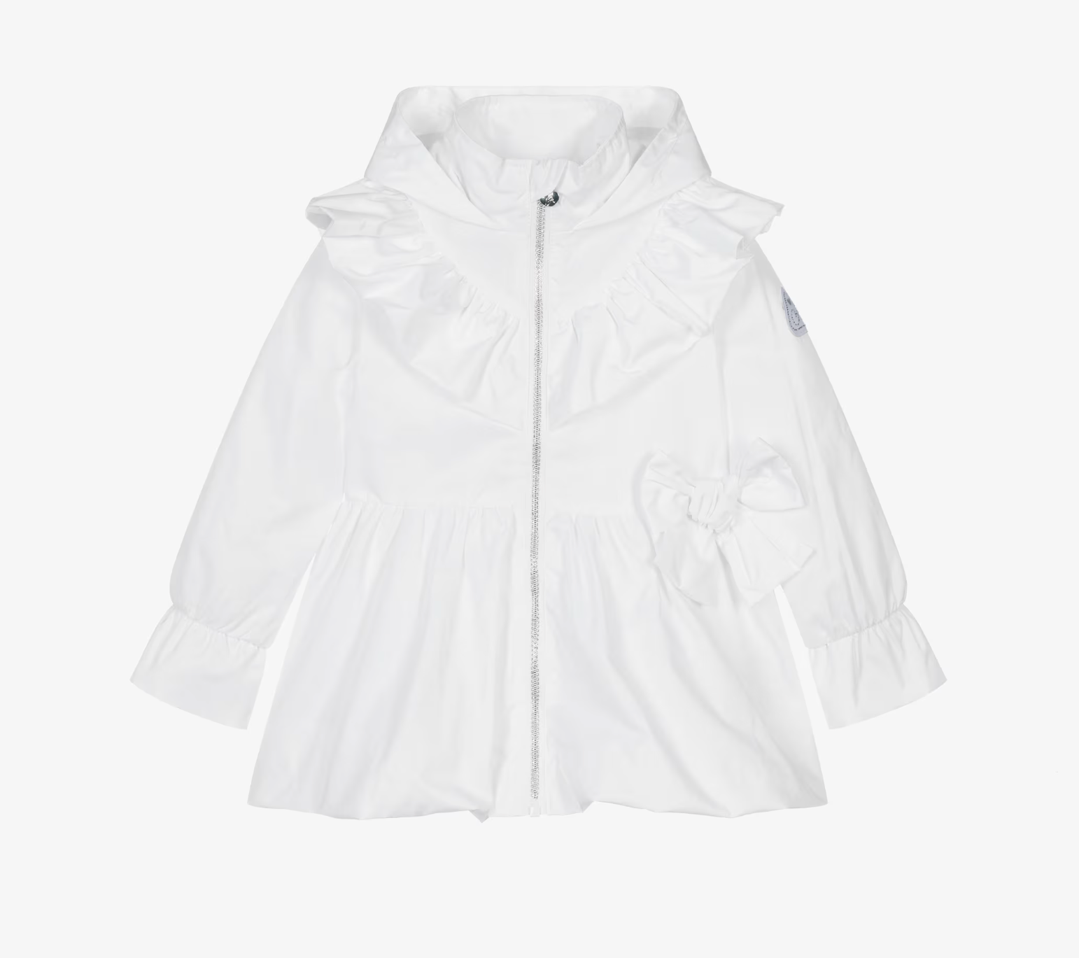 Introducing the Natalie jacket. Made from silky polyester, it features a puff hem, applique bow and frill details across the shoulders and at the arm cuffs. Finished with a diamante zip and branded puller logo badge on one arm.
