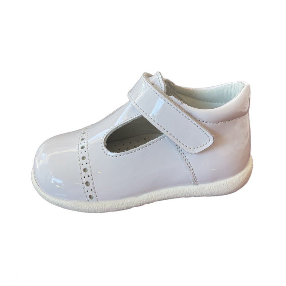Andanines Boys T-Bar Velcro Strap Shoe in White Patent