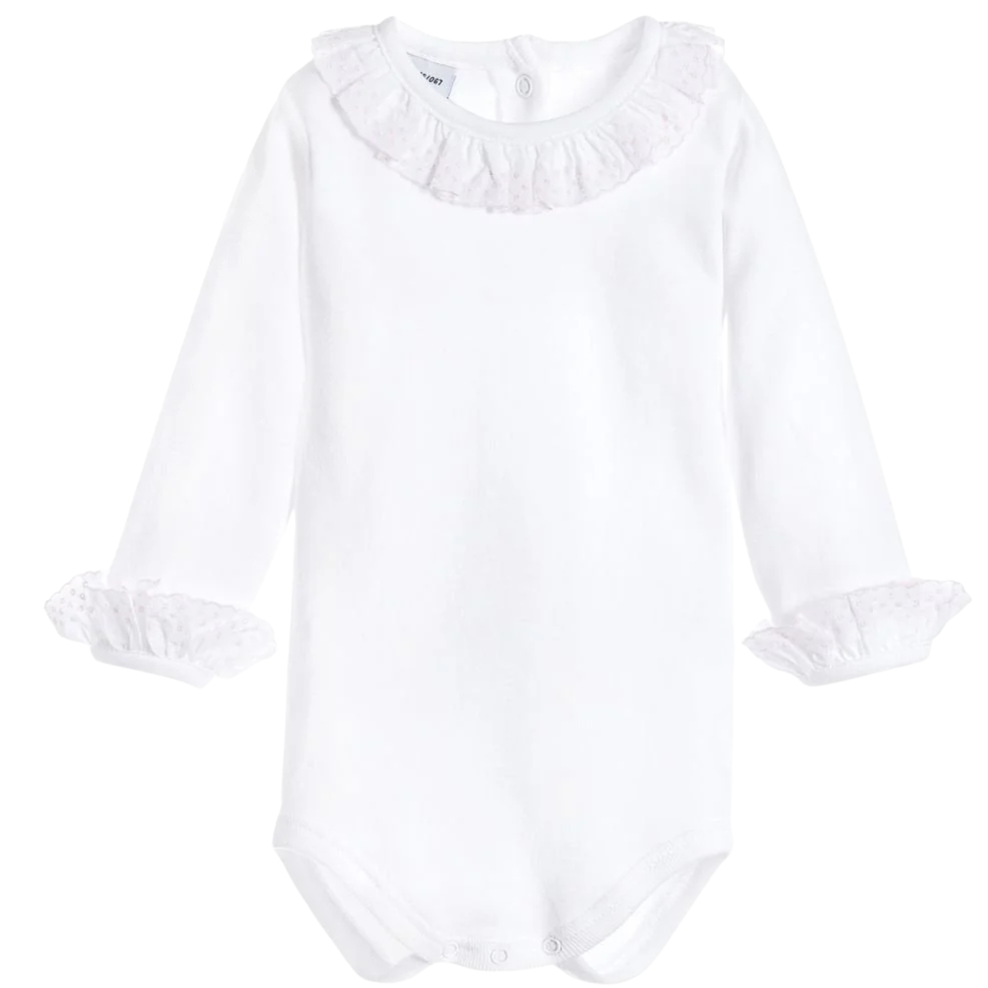 White bodysuit by Babidu. Made in soft cotton jersey, it has a pretty ruffle collar, featuring soft blue embroidery, matching the ruffles on the cuffs. It fastens with poppers running down the back and between the legs for easy dressing and nappy changes. A versatile and useful addition to baby's wardrobe, it won't ever become untucked and will keep little backs warm.