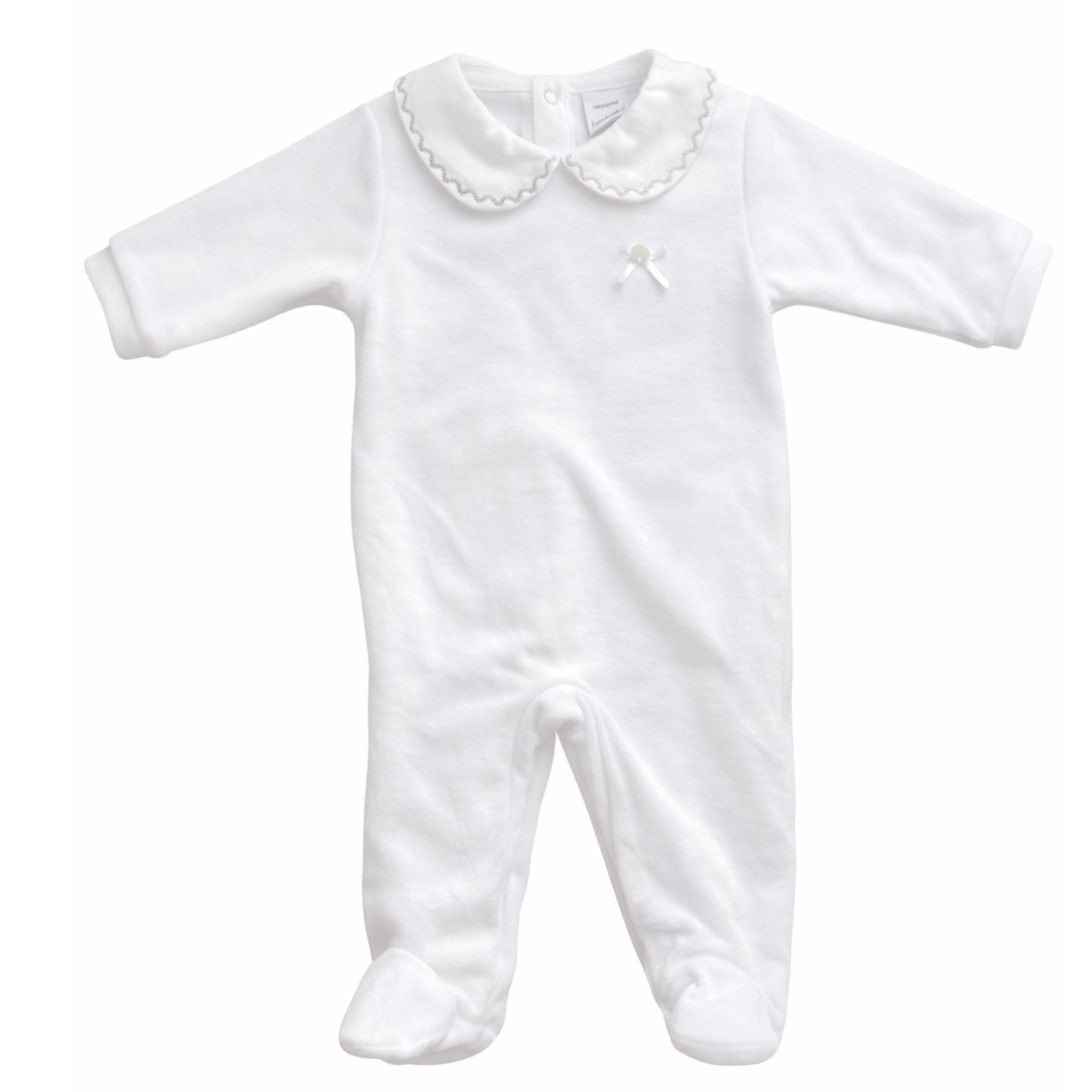 Soft white cotton velour babygrow for new baby by Babidu. With a white cotton collar and pale grey embroidery detail. It has popper fastenings on the back and between the legs.