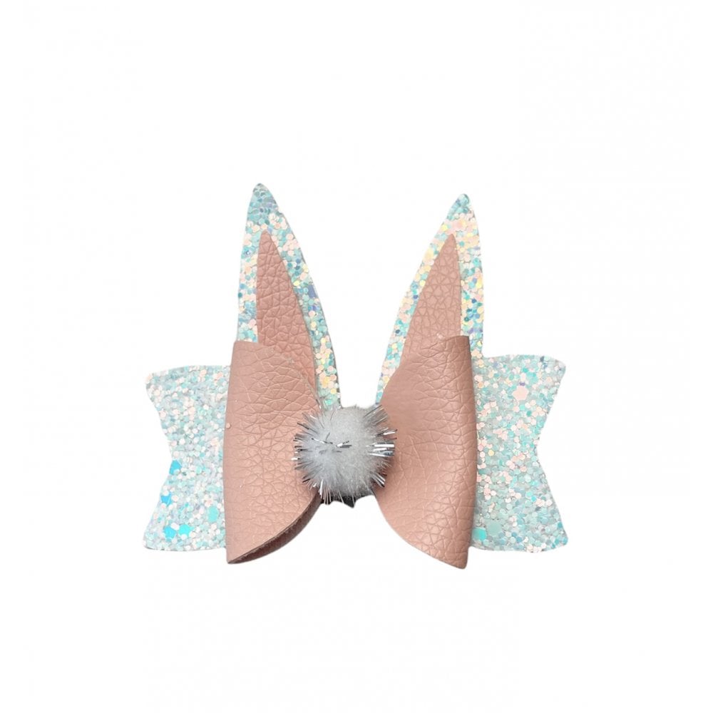 This adorable hairclip stands up when in the hair. It has a pink coloured bow, colourful glitter bunny ears and a sweet little pom-pom on a grosgrain covered crocodile clip.