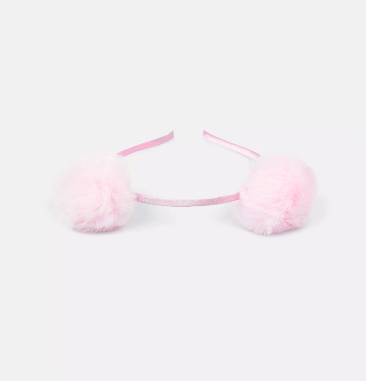 Girls cute pale pink faux fur pom-pom hairband from Blossom Bows, with a grosgrain covered flexible band.