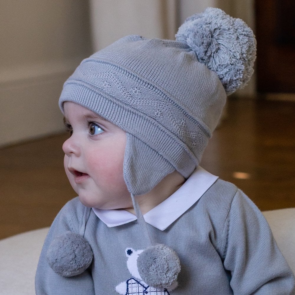 Pale grey by Emile et Rose. It is knitted in a double layer of comfortable cotton, with a pretty pattern all around. It has ear flaps for extra warmth, with pom-poms hanging from them and a large pom-pom on top.