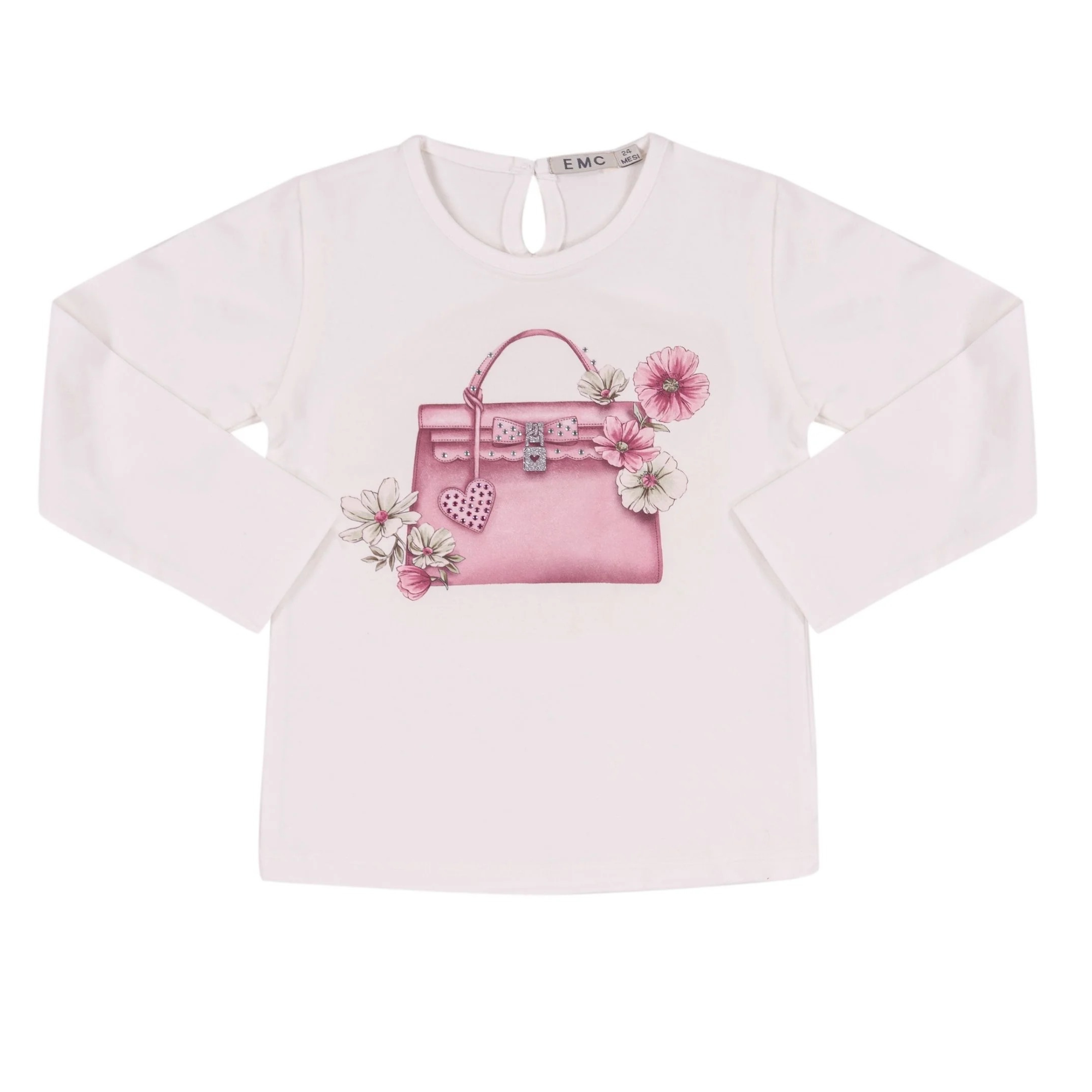 Ivory top for little girls by Everything Must Change, made in soft cotton jersey. It has a glittery pink handbag print on the front. There is a keyhole button fastening on the back.