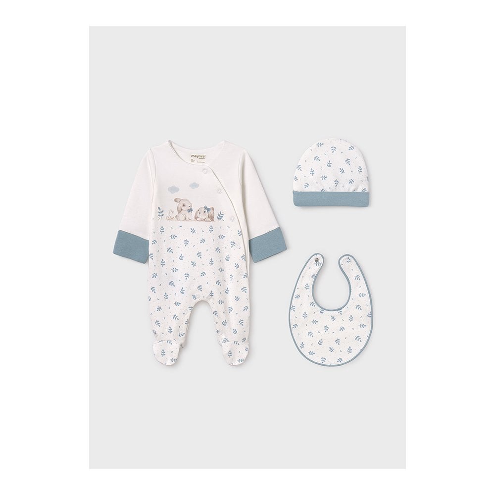 Fill their very first wardrobe with style with this boxed gift of babygrow from Mayoral with matching bib and hat.