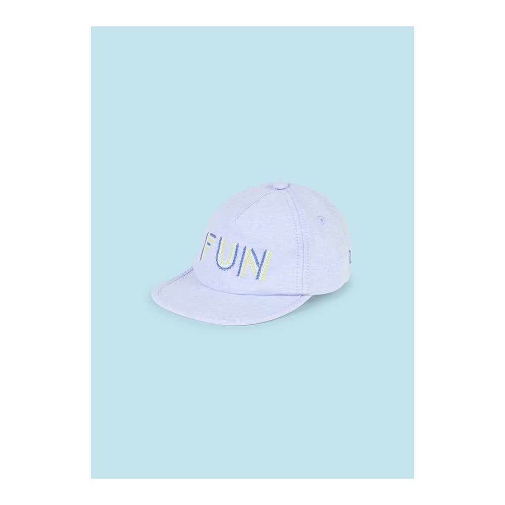 Baby boys light blue cotton cap by Mayoral. It has logo embroidery on the front, and an adjustable velcro strap at the back.