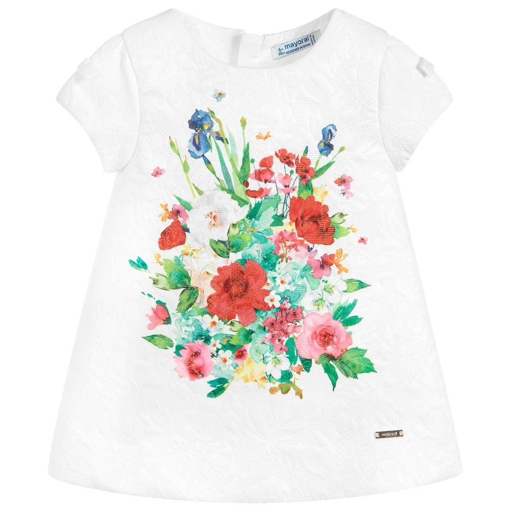 Baby, toddler girls white shift dress from Mayoral, with a red floral print. Made in soft floral jacquard, it has a lightweight cotton lining.
