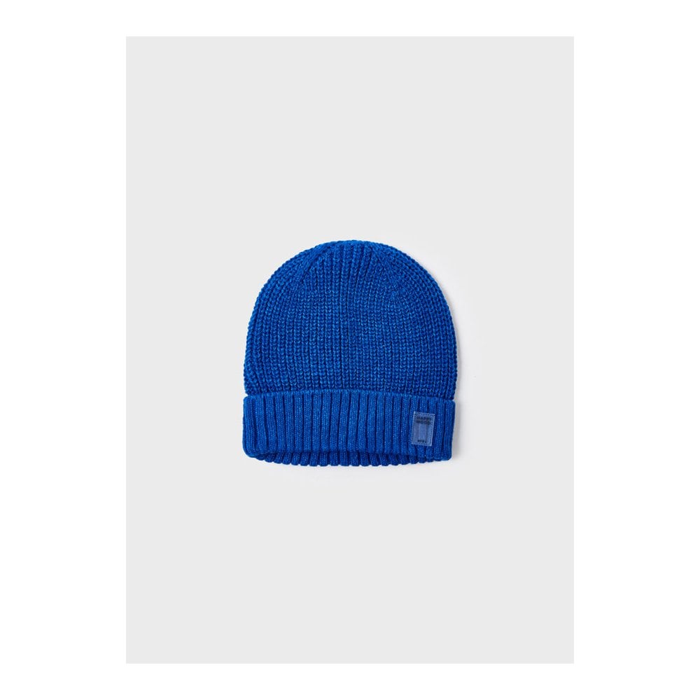 Cosy blue beanie hat for boys by Mayoral, in a soft, chunky knit. It has a clear rubber logo patch on the turned up brim, with the words 'Happy Mood' for a positive vibe.