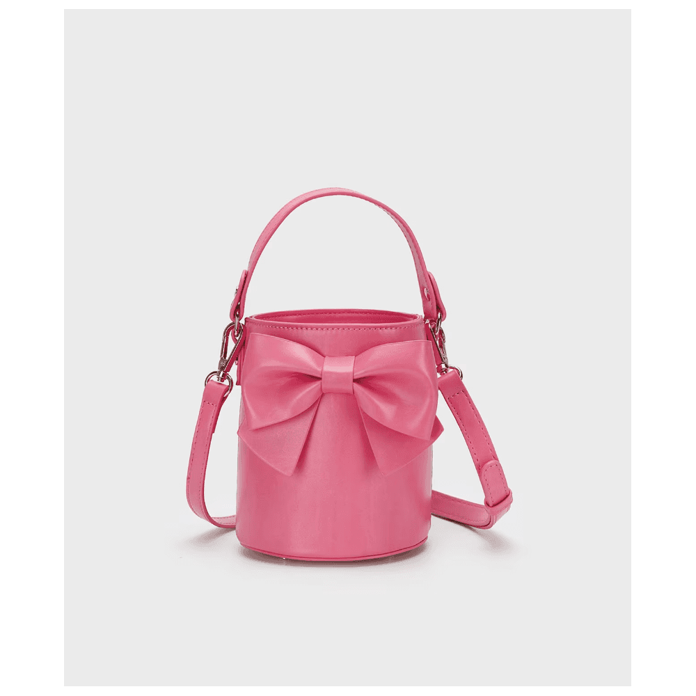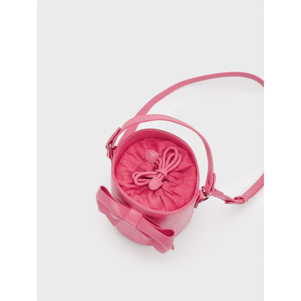Girls pink coloured bucket shaped handbag from Mayoral. It has one main compartment and a handle or over the shoulder strap.