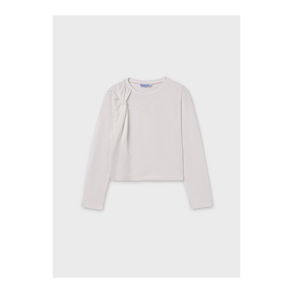 A soft ivory cotton jersey t-shirt for girls by Mayoral with a lovely shoulder design.