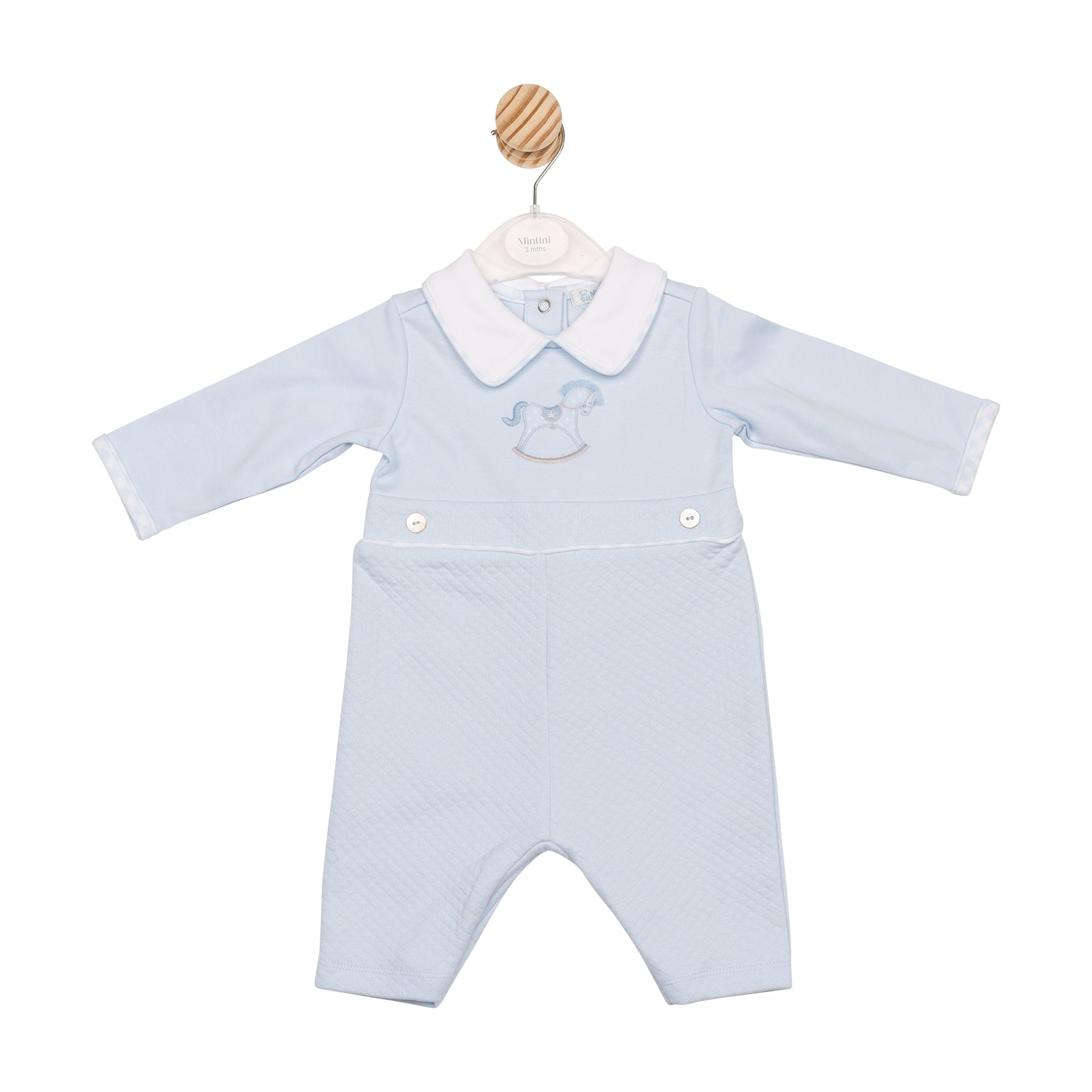 A gorgeous all in one baby blue outfit which is the perfect blend of style and comfort for your little one. This charming one piece features lovely detailing with display buttons and a small embroidered rocking horse in the centre, complemented by a white collar and cuffs. Designed for easy dressing, it includes poppers on one side. Made from 100% cotton, this all-in-one ensures exceptional softness and breathability.