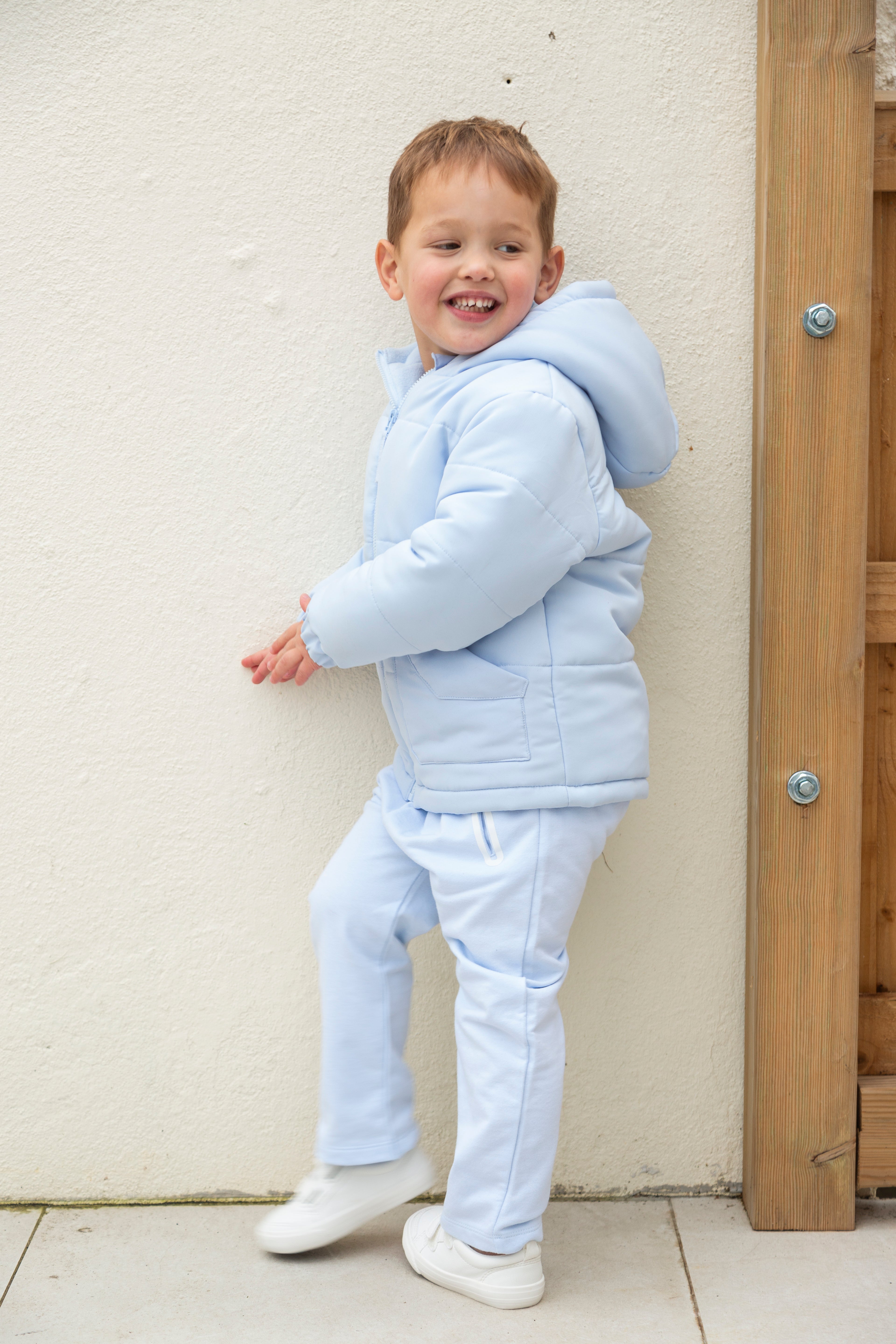 Crafted with warmth and style in mind, this coat features a luxurious pale blue faux fur hood, perfect for keeping your baby snug during chilly days.