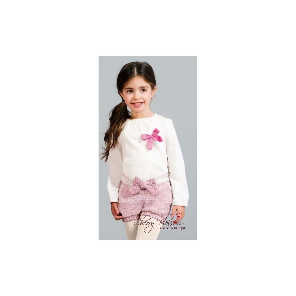 Miranda Girls pretty long sleeved t-shirt with pink satin bow on the chest. Matching traditional style shorts with lace waistband and large bow.
