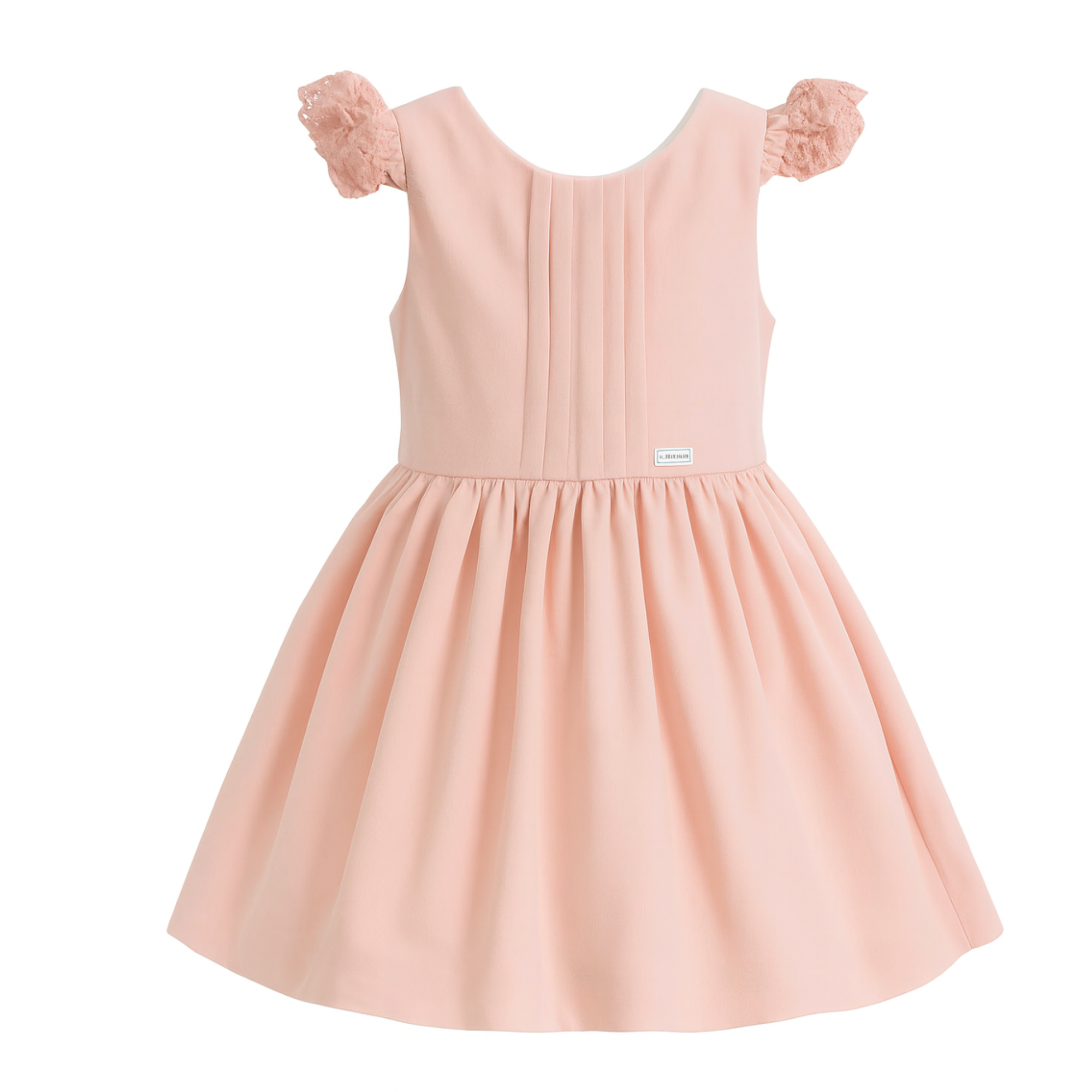 Girls peach textured dress with off the shoulder lace detailing by Spanish brand Miranda.