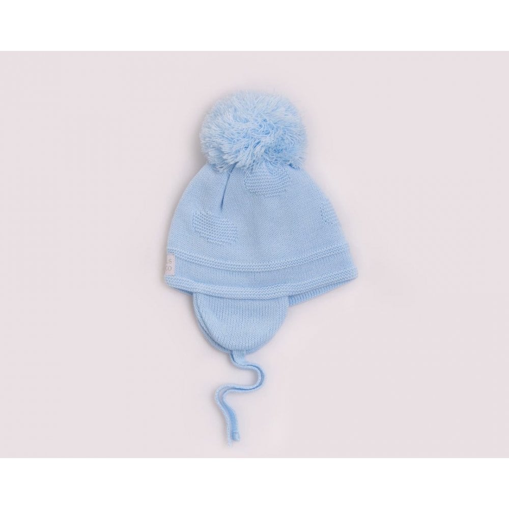 Pastels & Co, pale blue wool knitted hat with a large pale blue pom pom. It has ear flaps with string ties that fasten under the chin.