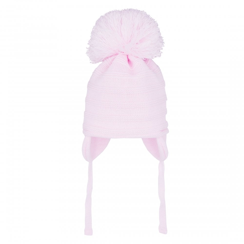 Pastels & Co, pale pink wool knitted hat with a large white pom pom. It has ear flaps with string ties that fasten under the chin.
