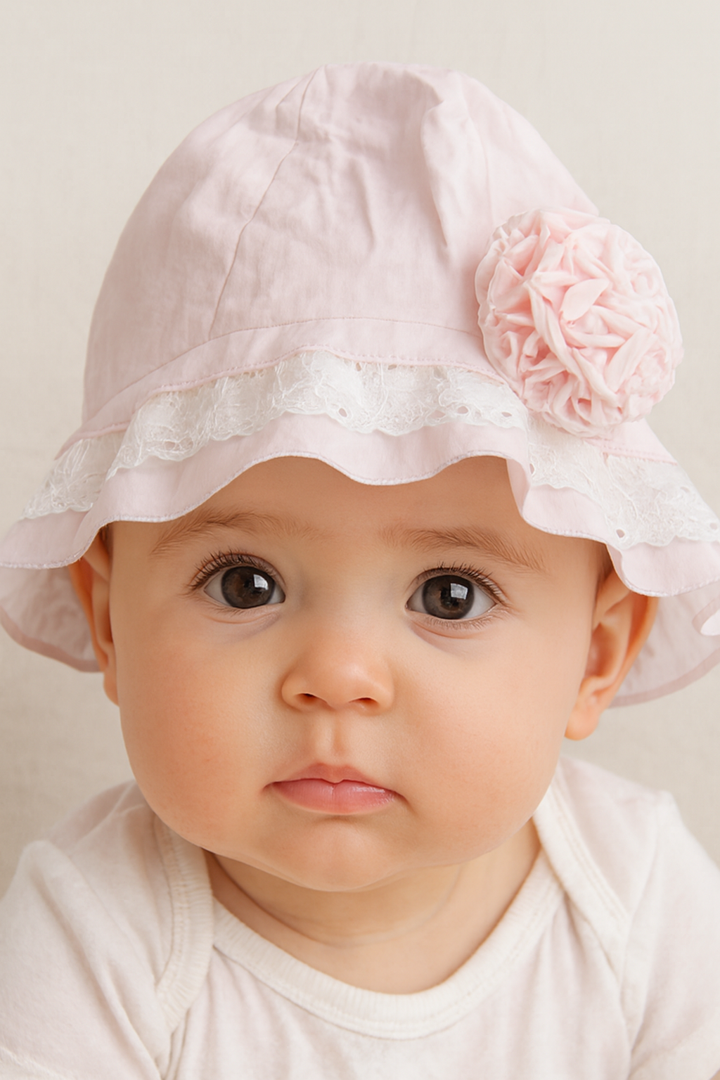 A pretty lightweight polycotton, pale pink sun hat for baby girls, by Sarah Louise. It has gorgeous broderie anglaise detail.