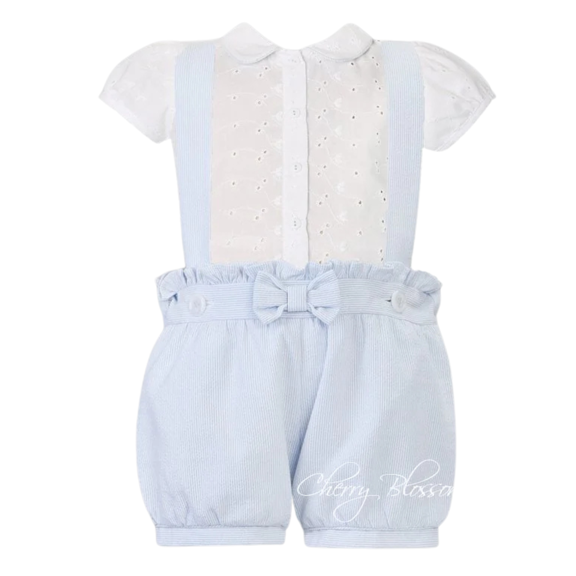 Girls pale blue dungaree romper from Dani by Sarah Louise. Made in soft cotton, with delicate ruffles and a bow. Comes with matching blouse.