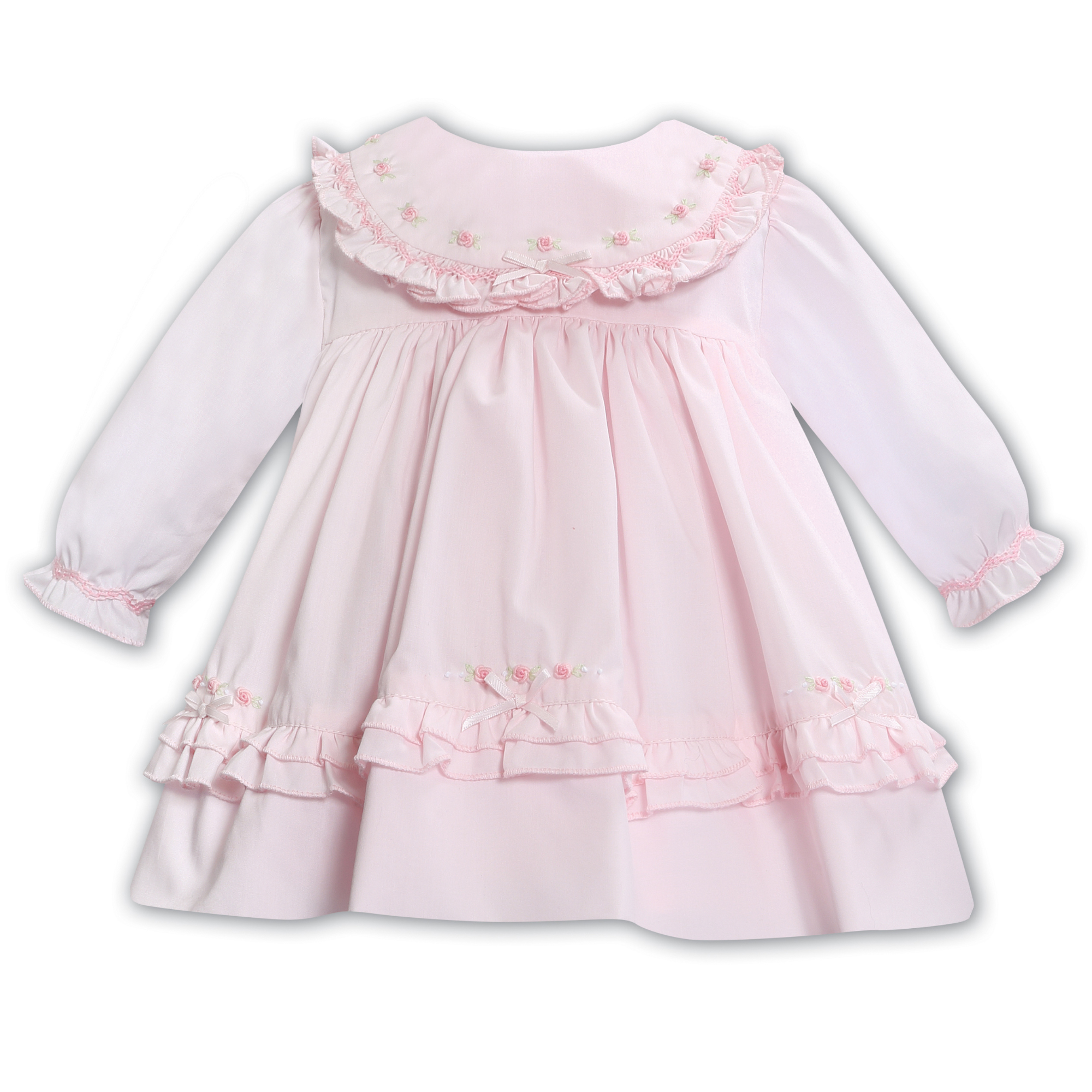 This sweet pink cotton dress from Sarah Louise is the perfect blend of charm and comfort for little girls. Made from lightweight pink lined cotton, the dress features a large rounded ruffle collar, beautifully hand-smocked and embroidered across the chest.