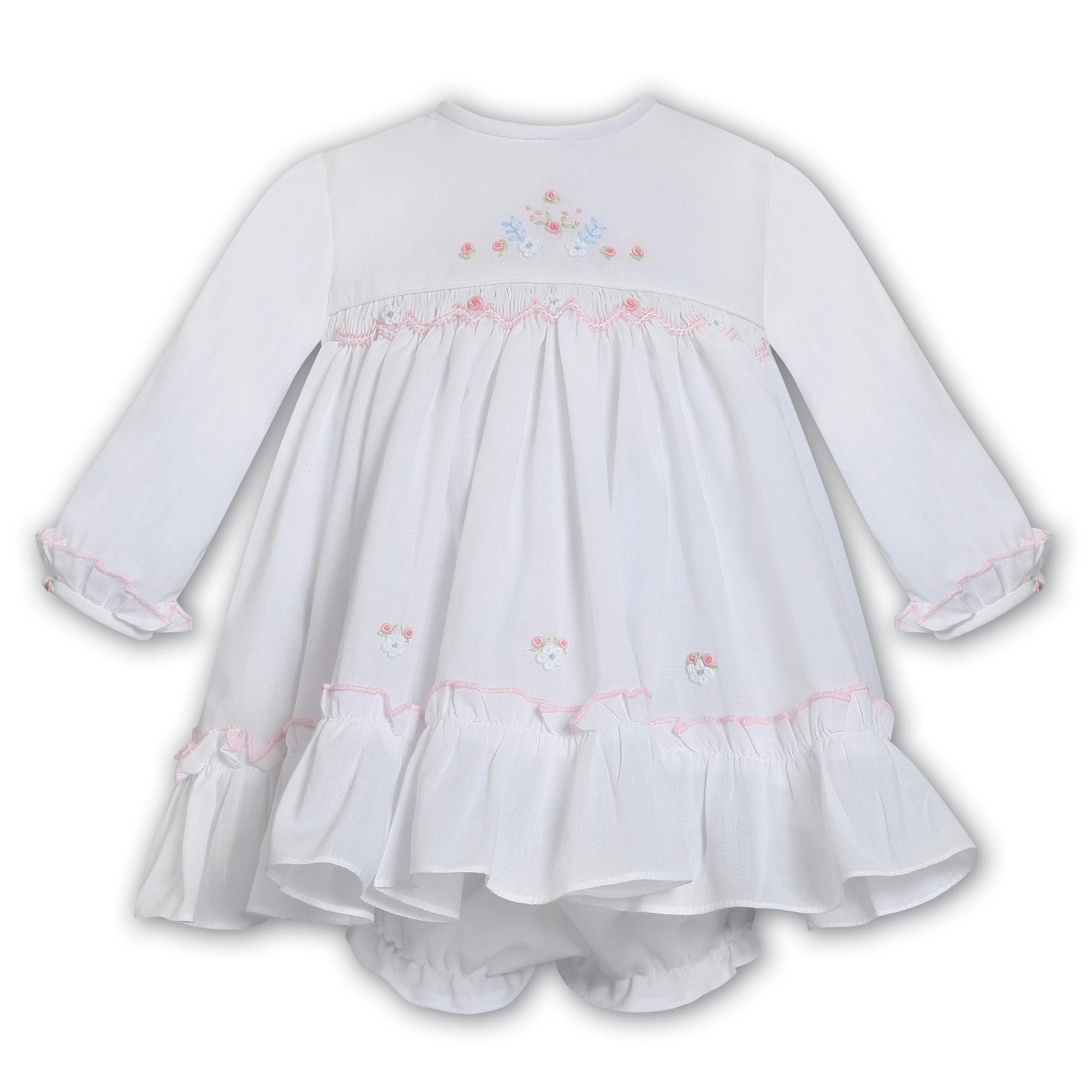 Girls white with pink traditional smocked dress by Sarah Louise. Made in soft polycotton, with pink and blue embroidery and smocking detail on the on the chest. Round neck and long sleeves.