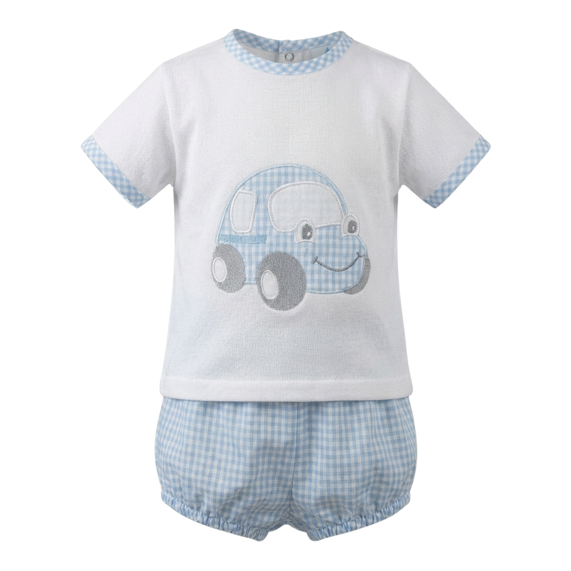 Lovely boys summer outfit with a cute car applique on the chest of the white t-shirt.