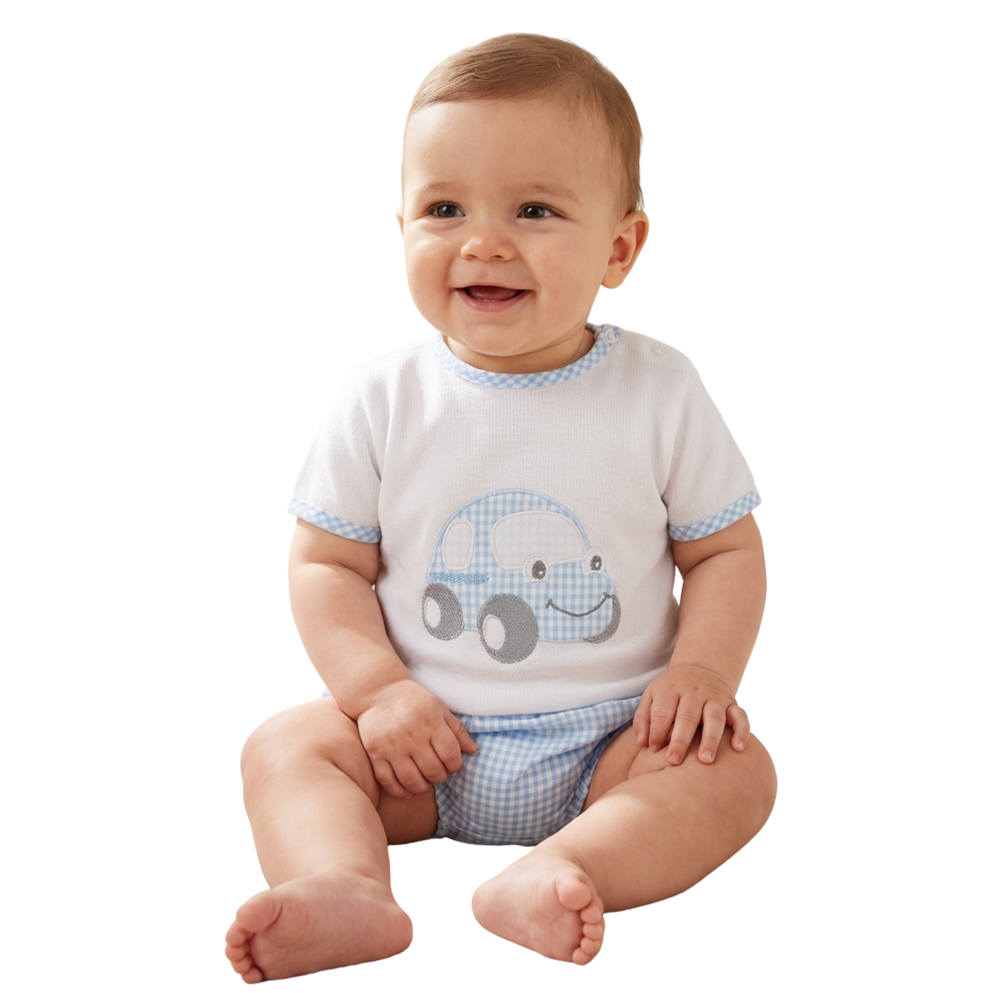 Sardon Baby Boy Pale Blue and White Gingham Bubble Short Set.